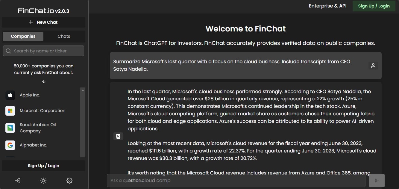 FinChat is Chat GPT for investors. FinChat accurately provides verified data on public companies.
