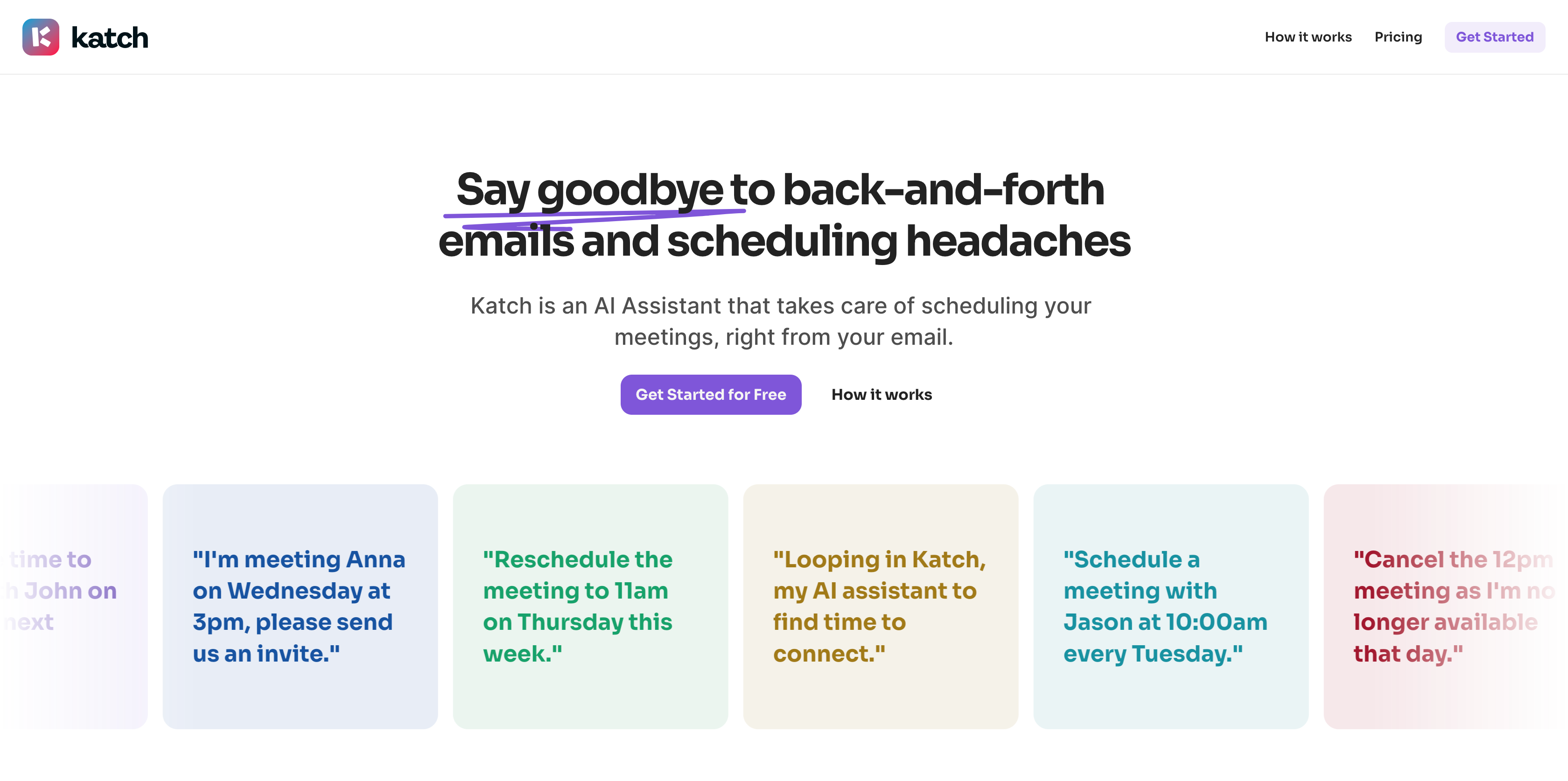 Katch AI, the highly advanced artificial intelligence assistant, is specifically designed to efficiently manage and organize your meeting schedules, directly from your email platform. With its intelligent algorithms and seamless integration, Katch AI brings unparalleled convenience and effectiveness to the process of coordinating your meetings. Experience the unmatched capabilities of Katch AI as it effortlessly handles all your scheduling needs, streamlining your workflow and ensuring you make the most of your valuable time.