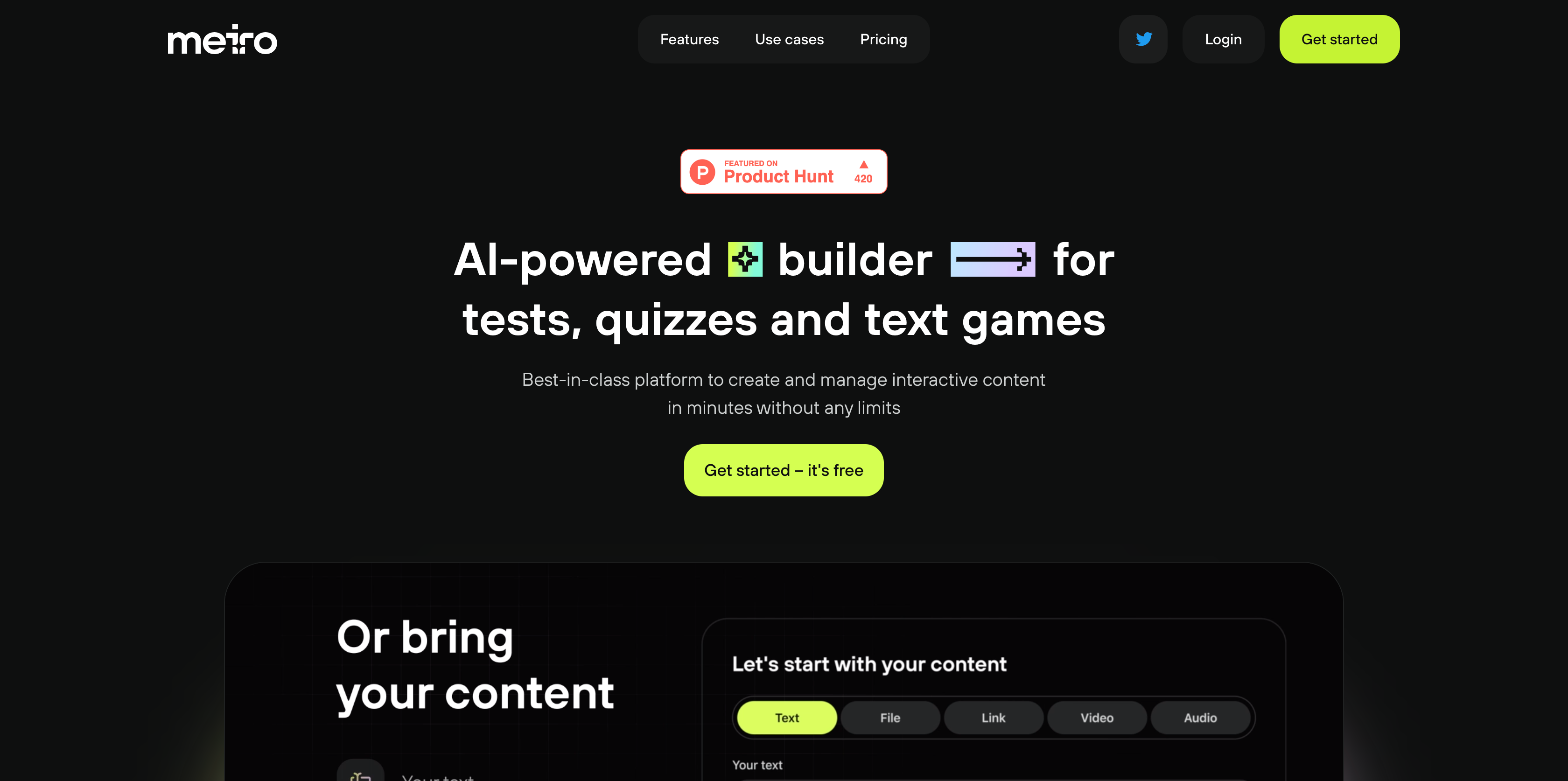 Meiro employs artificial intelligence to produce custom-tailored interactive material through tests, quizzes, and text-based games.