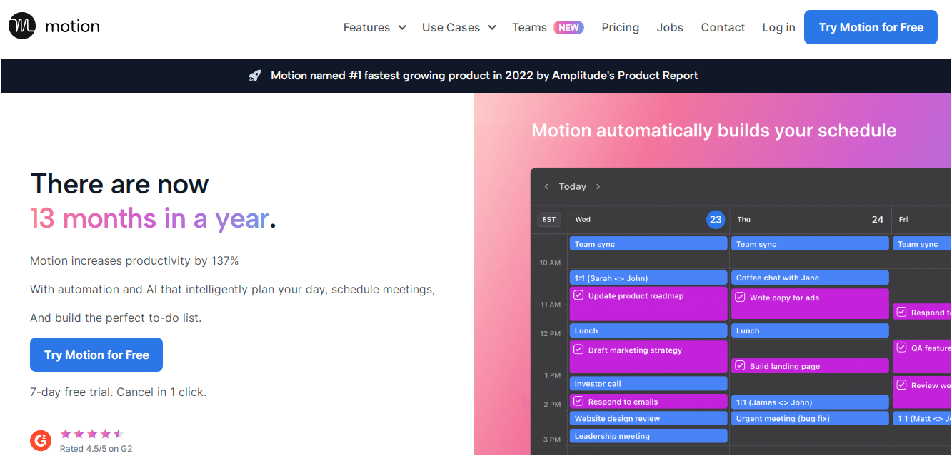 Motion is a smart solution that employs artificial intelligence to generate everyday timetables which accommodate your appointments, assignments, and undertakings. Bid farewell to the inconvenience of organizing and welcome a more efficient existence.