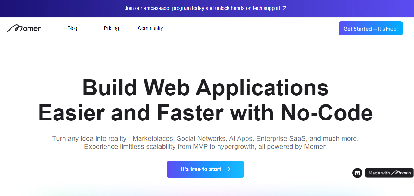 Momen is a platform that eliminates the need to write code to create web applications. With its intuitive drag-and-drop interface, even the most complicated apps can be built with minimal effort. With features like an integrated backend and search engine optimization (SEO), Momen is a potent instrument for creating enterprise-grade applications. Momen’s emphasis on performance and scalability distinguishes it from other no-code platforms. Thanks to Momen’s scalable backend design, which can accommodate any traffic size and user growth, you can rest easy knowing that your apps can handle even the most taxing workloads.