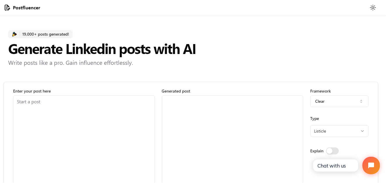 Postfluencer is an AI-driven application that enables users to effortlessly generate LinkedIn updates. This software offers a convenient and effective method for sharing captivating content on professional social media platforms. Users can effortlessly input their material and select from a variety of frameworks, including Matt Barker’s PCR framework, ClearPAIPS, Story, Hero’s Journey, and Simple. Moreover, users can choose different post formats such as a listicle or a standard paragraph. Enhancing flexibility, users can readily customize their posts to align with specific content guidelines and cater to the preferences of their target audience. To top it off, Postfluencer leverages OpenAI’s state-of-the-art AI technology, ensuring precise and efficient post generation. With this exceptional feature, LinkedIn users can save valuable time and effort while creating engaging content for their network, all thanks to OpenAI’s pioneering role in artificial intelligence.