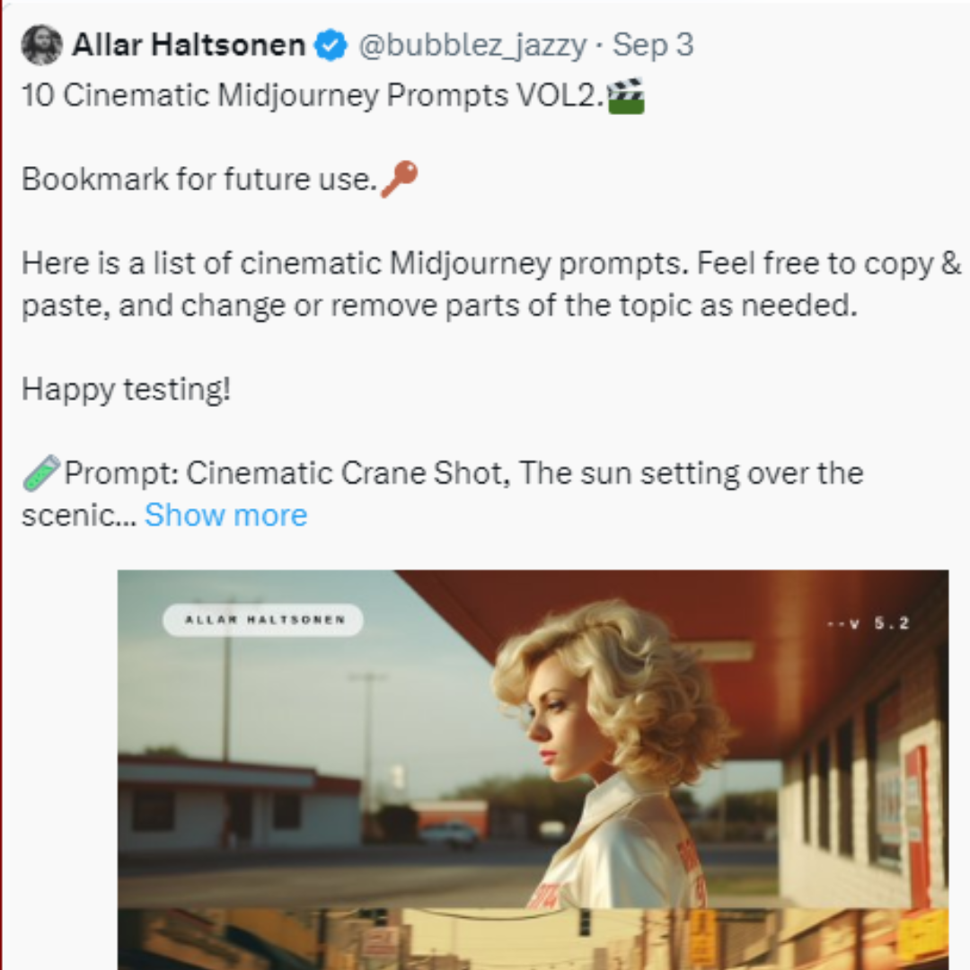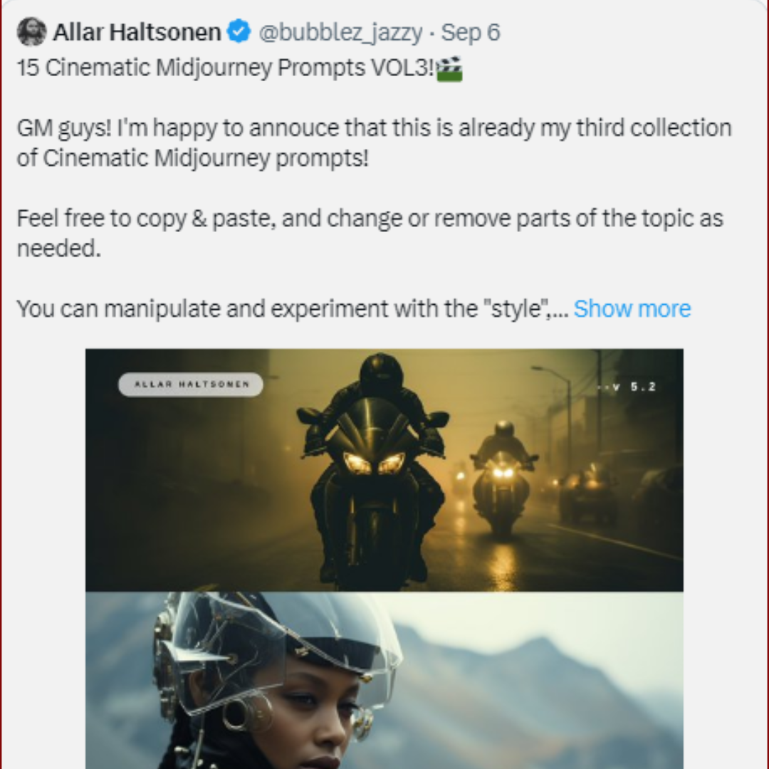 1. Cinematic Midjourney Prompts from @bubblez_jazzy